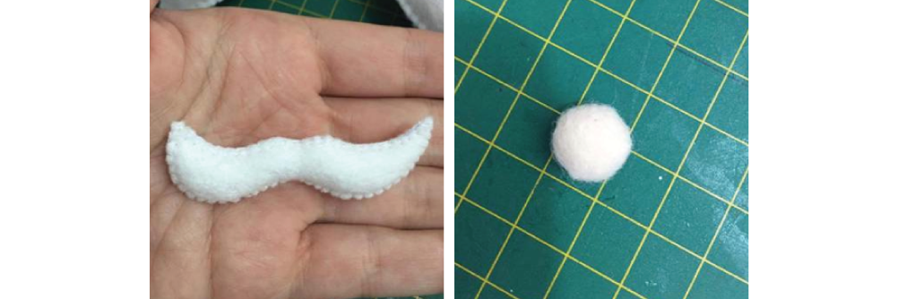 5. Para o bigode, uma as partes com caseado, encha com a fibra. Para o nariz, faça um fuxico e encha com a fibra siliconada;