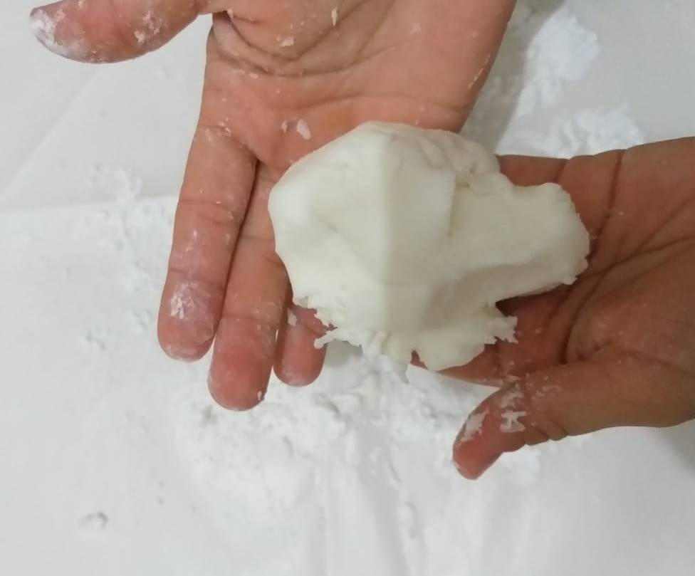 7. Continue sovando até a massa ficar lisinha. Vá jogando pouquinho de amido pra não grudar na mão. Quando ela ficar assim, já é hora de começar a abrir.